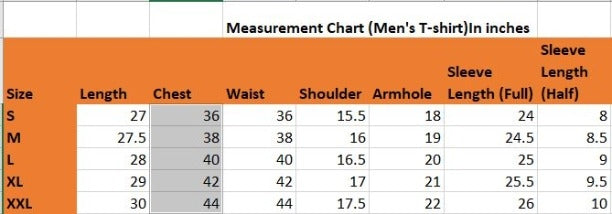 Size Chest Measurements (In Inches): S-36, M-38, L-40, XL-42, XXL-44